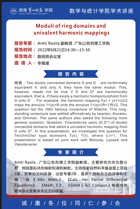 学术预告|Moduli of ring domains and univalent harmonic mappings