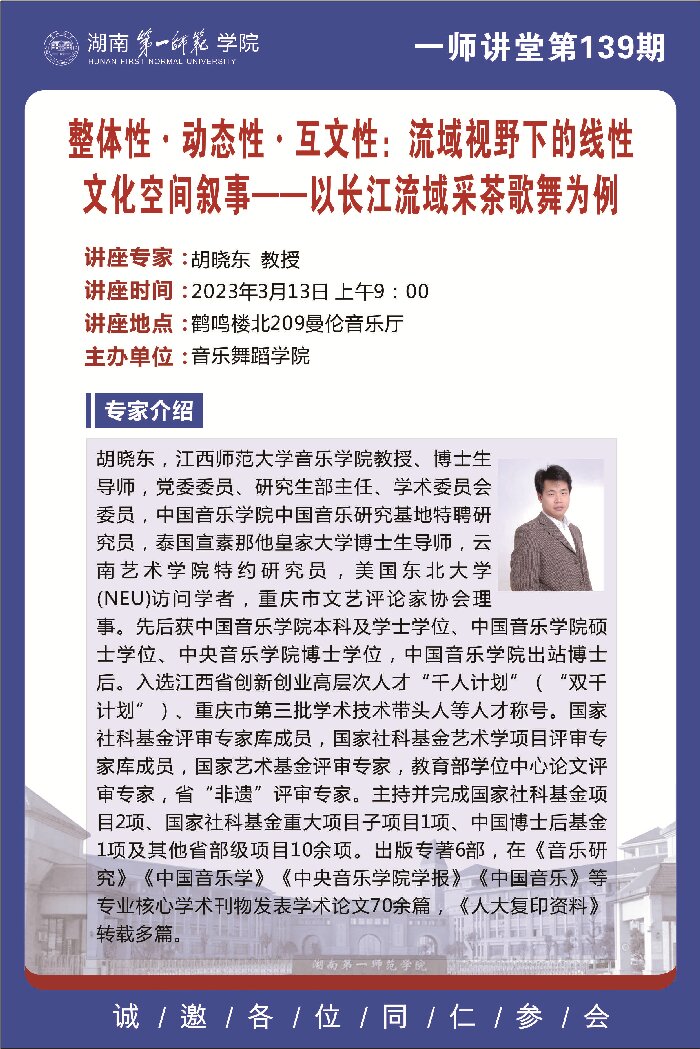 学术预告|一师讲堂第139期:整体性·动态性·互文性:流域视野下的线性文化空间叙事——以长江流域采茶歌舞为例