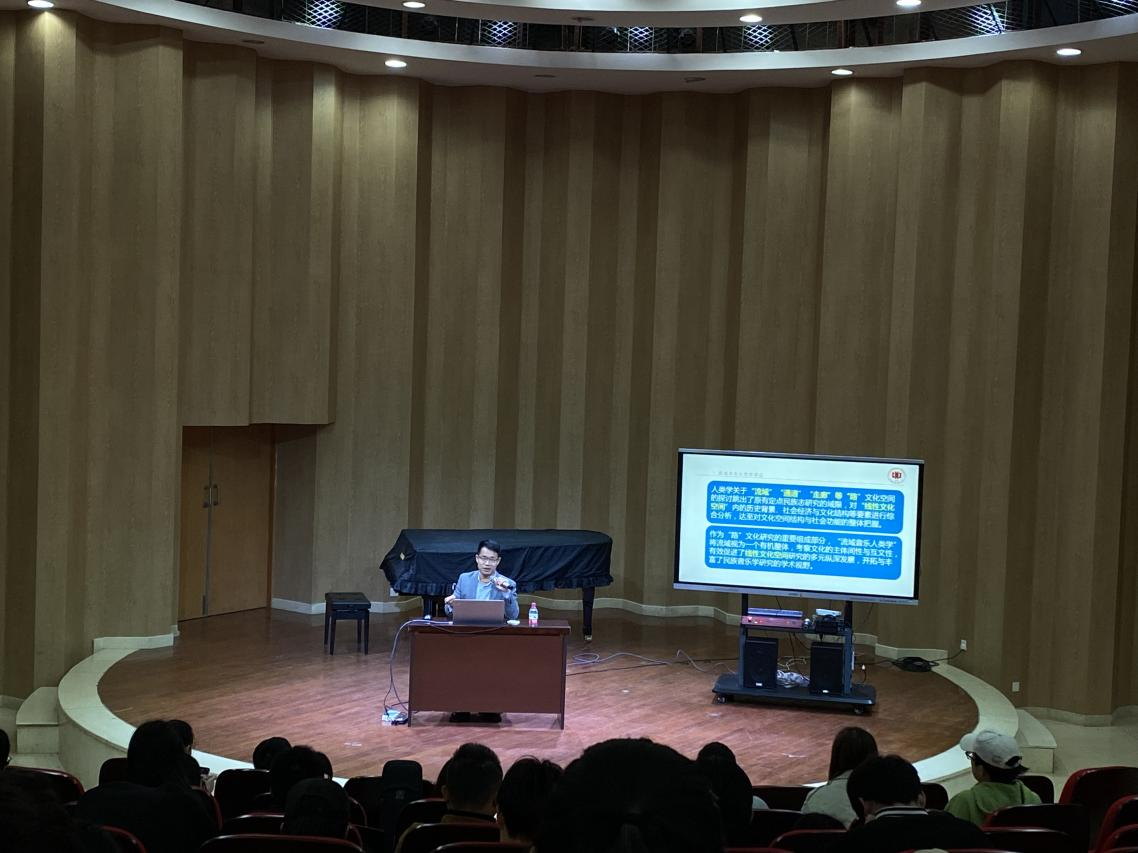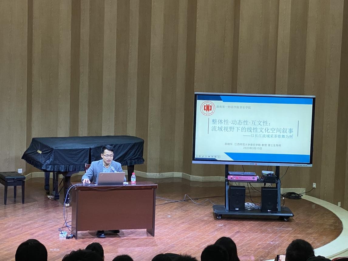 2023年3月13日上午9点,江西师范大学音乐学院教授、博士生导师胡晓东教授在鹤鸣楼北曼仑音乐厅为我院师生作主题为《整体性·动态性·互文性:流域视野下的线性文化空间叙事——以长江流域采茶歌舞为例》的学术讲座。讲座由音乐舞蹈学院党委书记邹华秀主持,音乐舞蹈学院师生聆听了讲座。