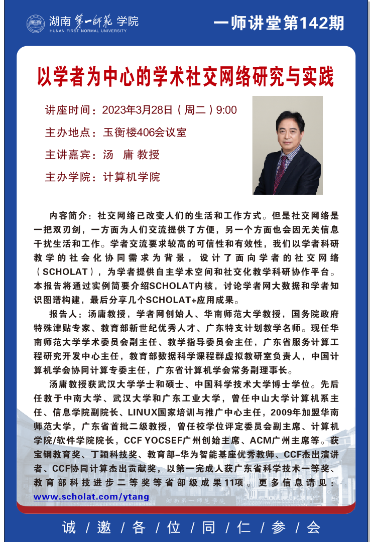 学术预告|一师讲堂第142期:以学者为中心的学术社交网络研究与实践