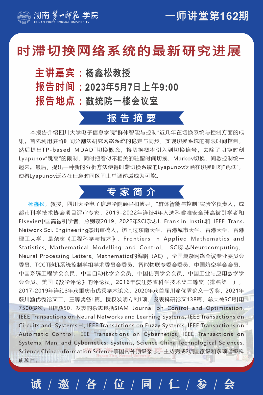 学术预告|一师讲堂第162期:时滞切换网络系统的最新研究进展