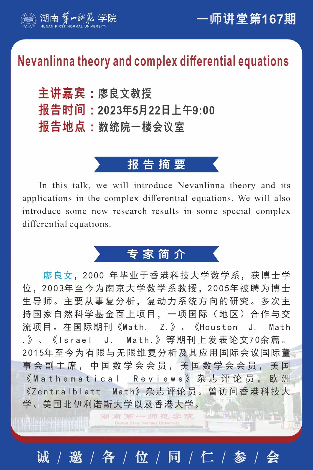 学术预告|一师讲堂第167期:Nevanlinna theory and complex differential equations