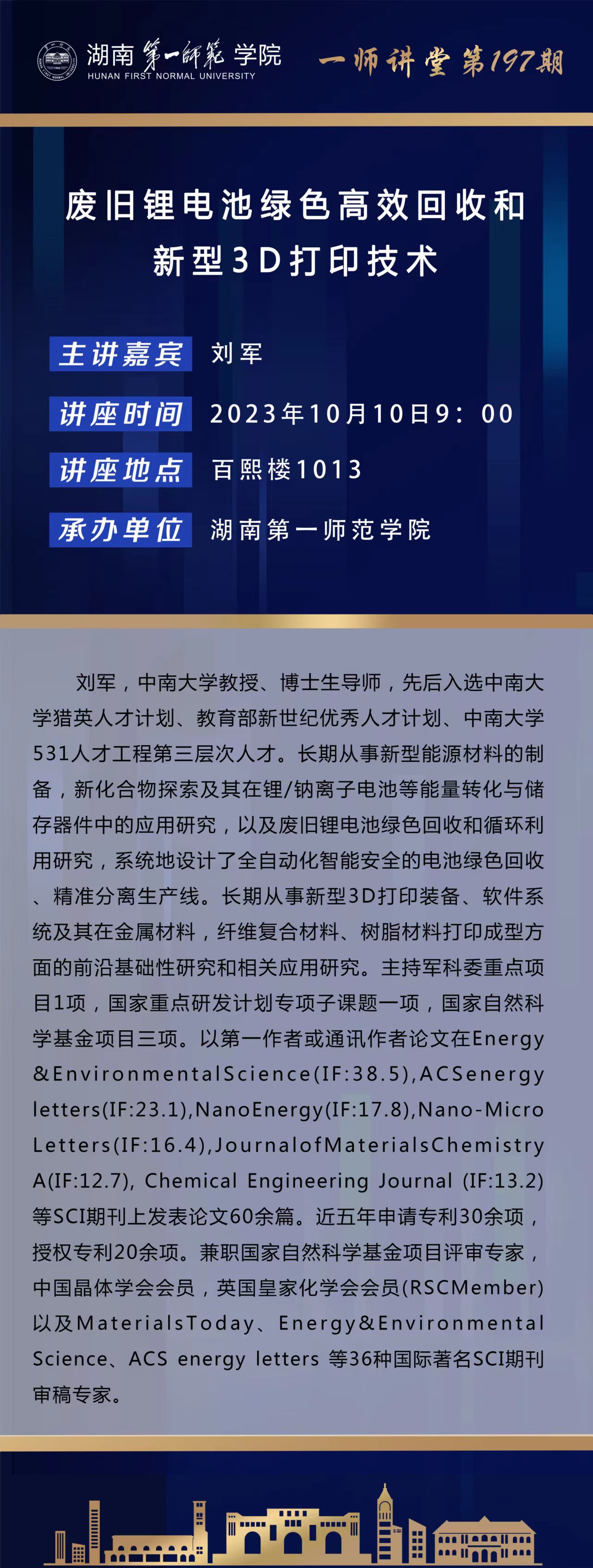 学术预告|一师讲堂第197期:废旧锂电池绿色高效回收和新型3D打印技术
