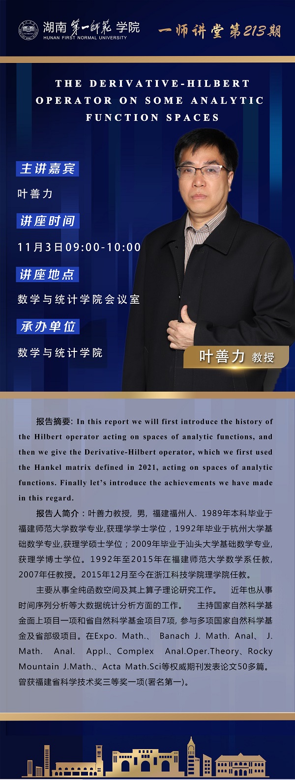 学术预告|一师讲堂第213期:THE DERIVATIVE-HILBERT OPERATOR ON SOME ANALYTIC FUNCTION SPACES