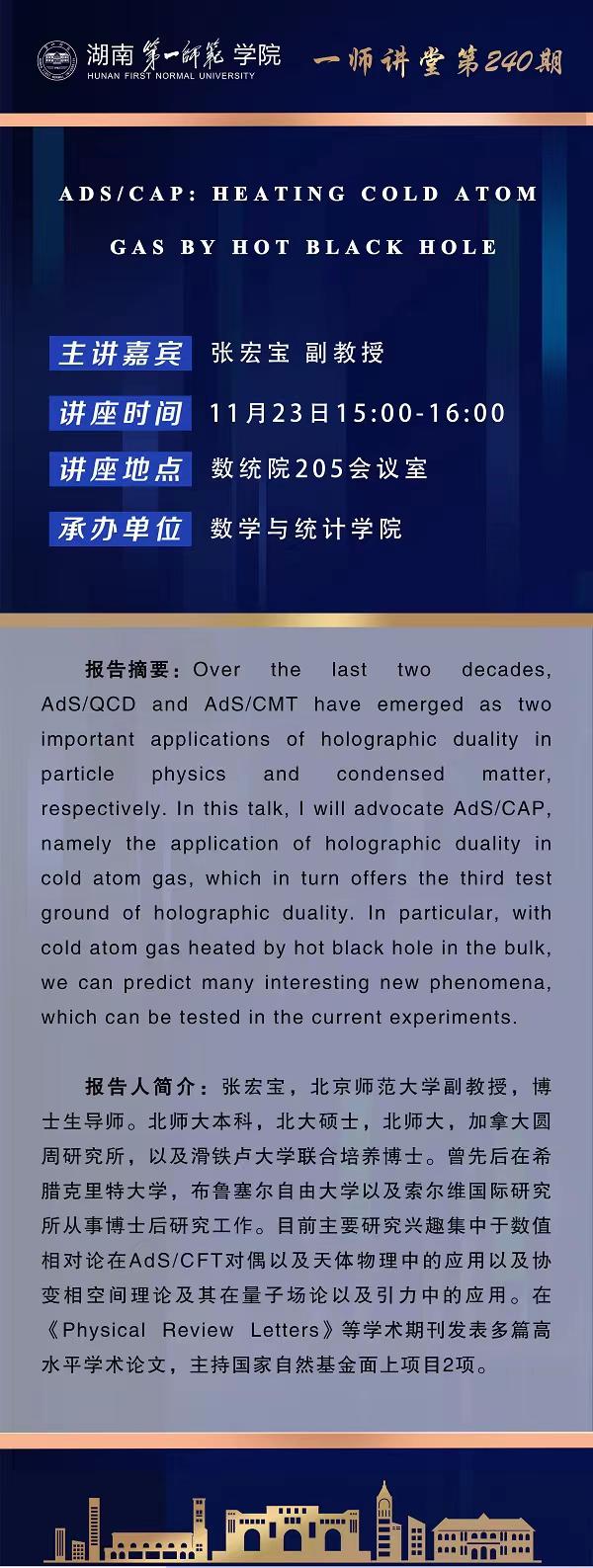 学术预告|一师讲堂第240期:ADS/CAP:HEATIING COLD ATOM GAS BY HOT BLACK HOLE