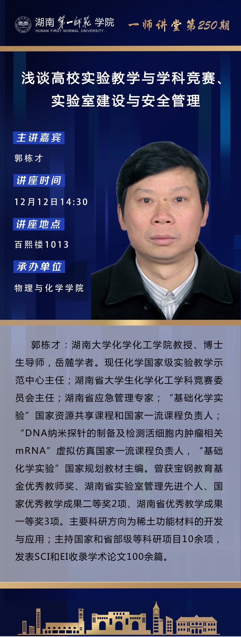 学术预告|一师讲堂第250期:浅谈高校实验教学与学科竞赛、实验室建设与安全管理