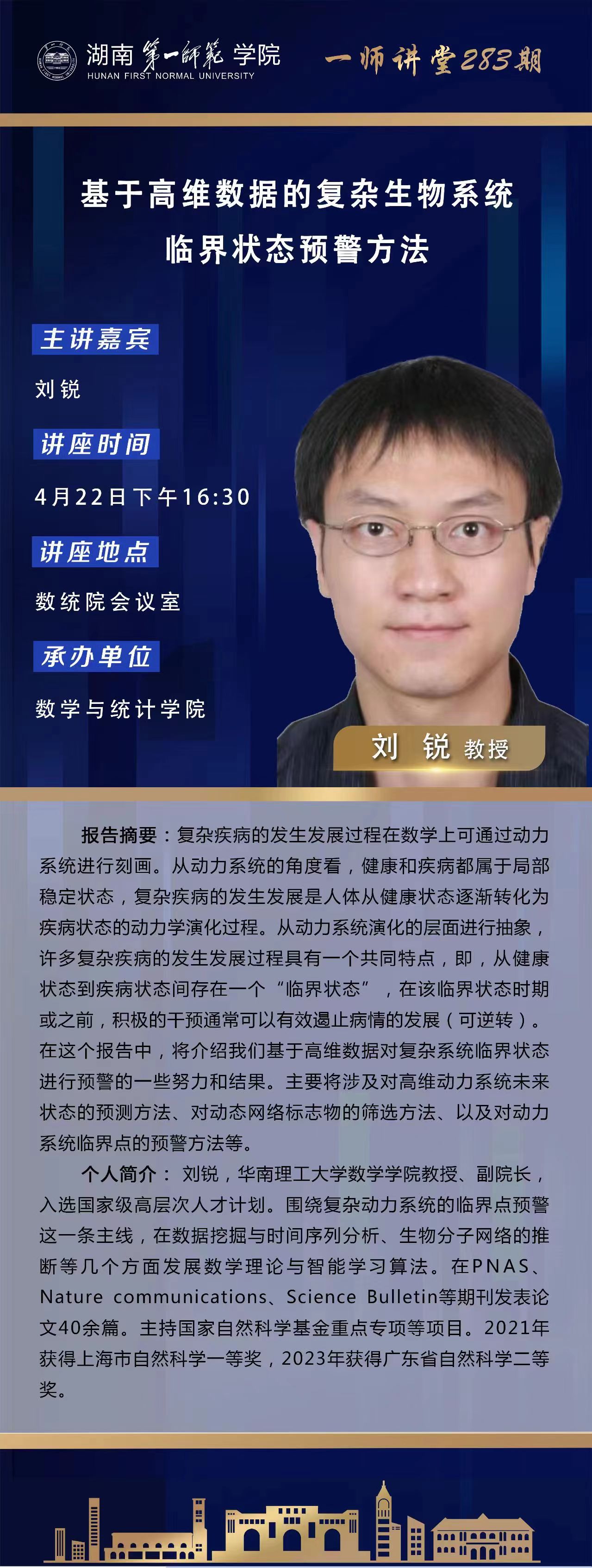 学术预告|一师讲堂第283期:基于高维数据的复杂生物系统临界状态预警方法