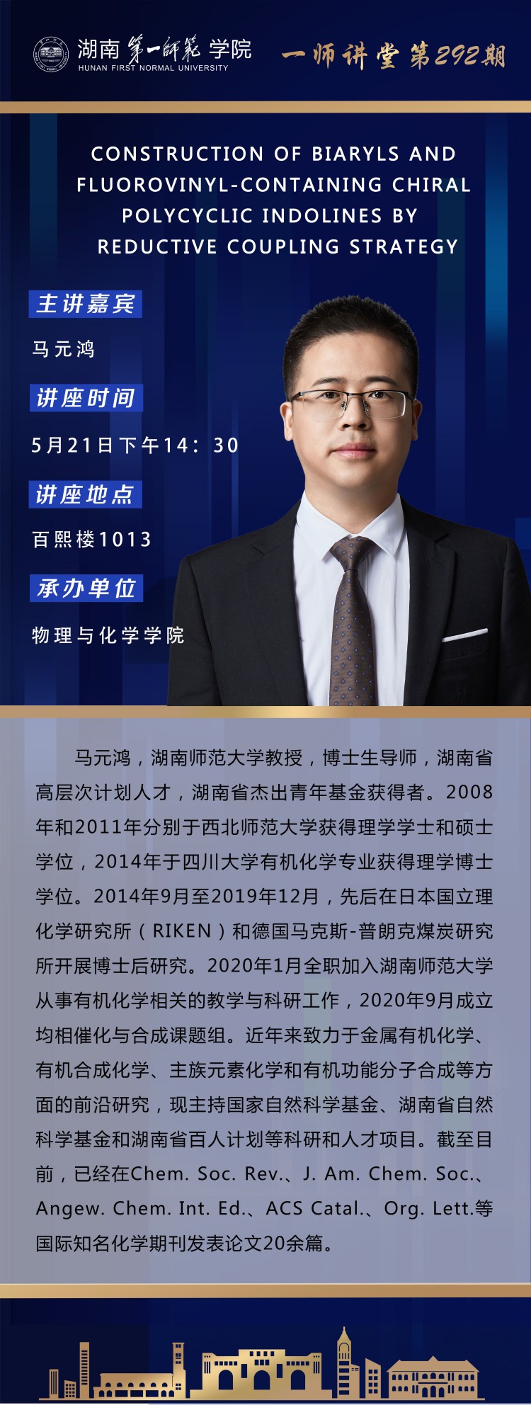学术预告|一师讲堂第292期:CONSTRUCTION OF BIARYLS AND FLUOROVINYL-CONTAINING CHIRAL POLYCYCLIC INDOLINES BY REDUCTIVE COUPLING STRATEGY