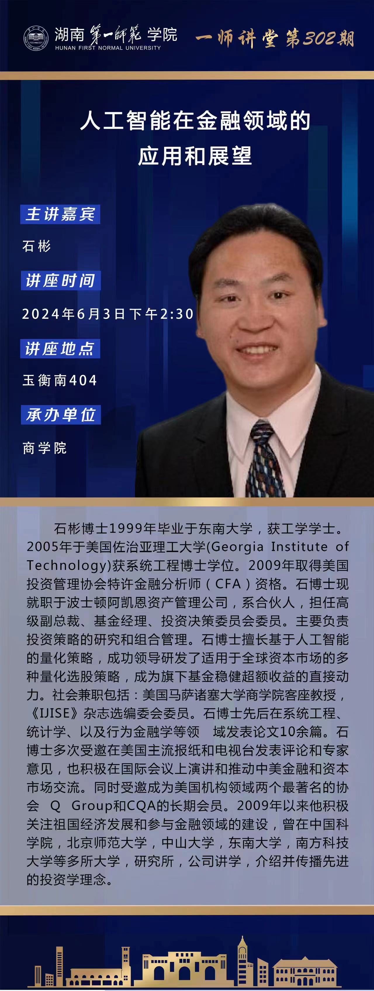 学术预告|一师讲堂第302期:人工智能在金融领域的应用和展望
