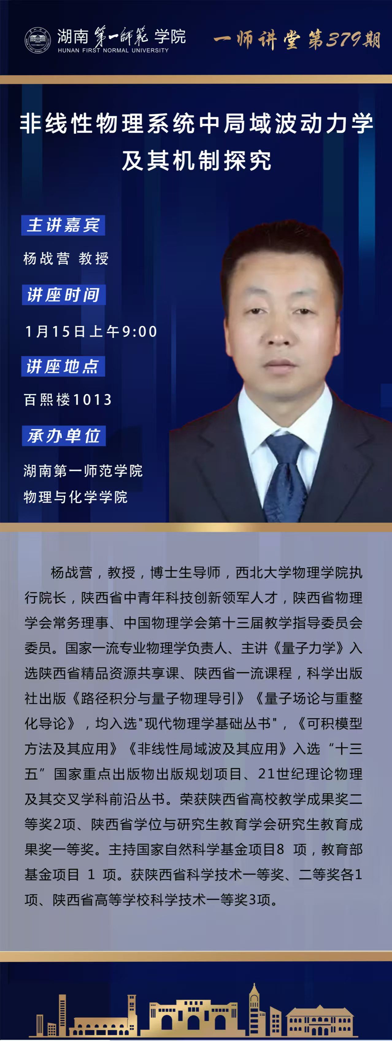 学术预告:一师讲堂第379期:非线性物理系统中局域波动力学及其机制探究