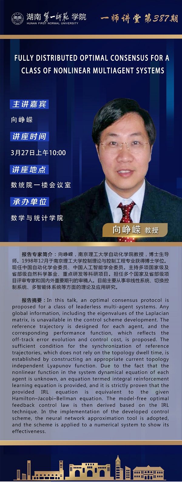 学术预告|一师讲堂第387期:FULLY DISTRIBUTED OPTIMAL CONSENSUS FOR A CLASS OF NONLINEAR MULTIAGENT SYSTEMS
