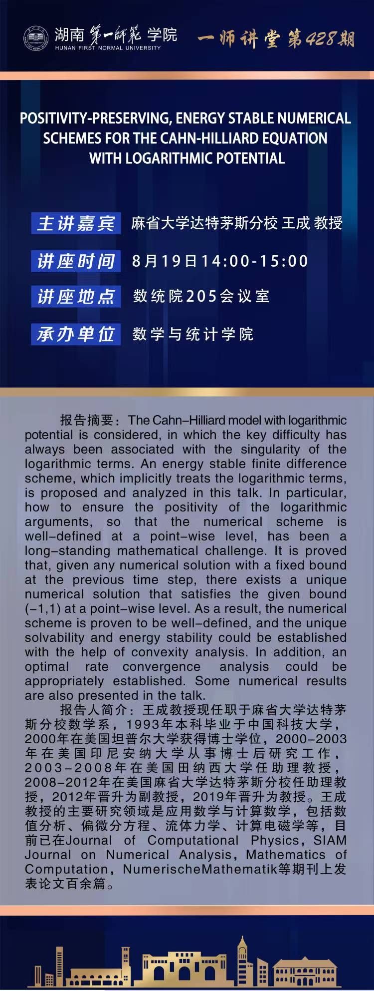 学术预告|一师讲堂第428期:POSITIVITY-PRESERVING, ENERGY STABLE NUMERICAL SCHEMES FOR THE CAHN-HILLIARD EQUATION WITH LOGARITHMIC POTENTIAL