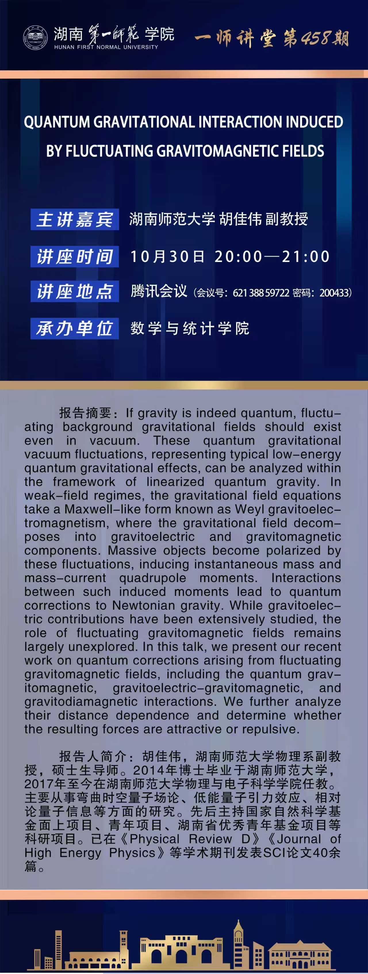 学术预告|一师讲堂第458期:QUANTUM GRAVITATIONAL INTERACTION INDUCED BY FLUCTUATING GRAVITOMAGNETIC FIELDS