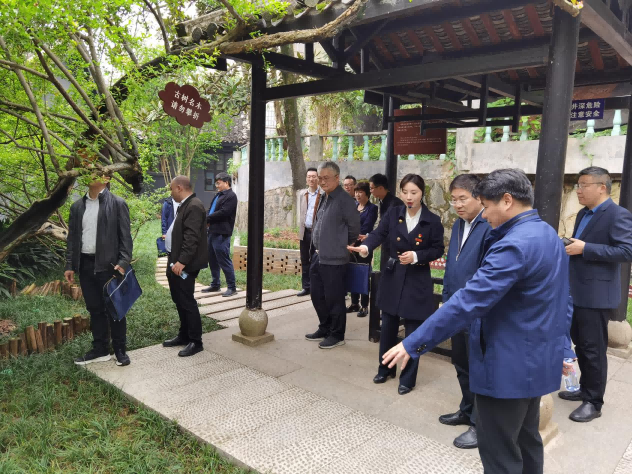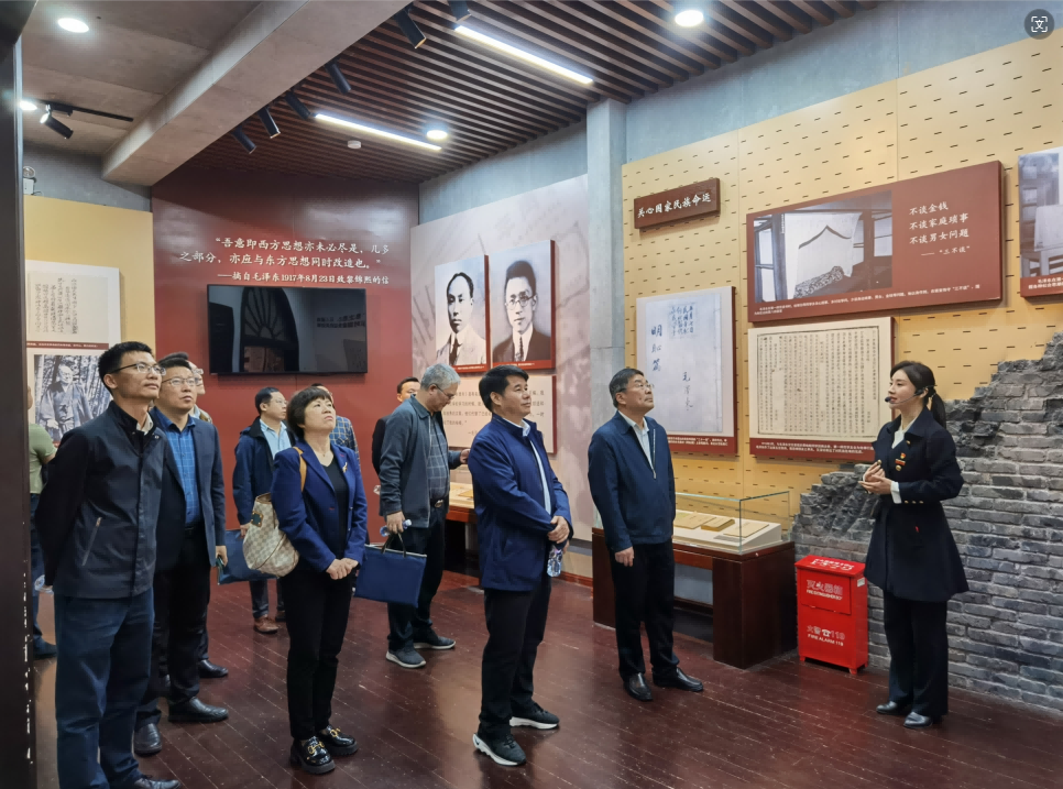 来到纪念馆前厅,两侧墙壁上毛泽东同志题写的“要做人民的先生,先做人民的学生”和徐特立先生题写的“实事求是、不自以为是”,十分醒目。在讲解员、教师邹磊的介绍下,两个党支部的全体党员对这23个字有了新的认识和感悟。随后,跟随讲解员的脚步,柴世钦、周发明以及两个支部的全体党员沿着青年毛泽东成长的足迹,认真参观了系列展馆,以及红色纪念点“第八班教室、第八班寝室、城南古井、大剧院、君子亭”等。柴世钦每到一个展馆和红色纪念点,都会停下脚步、驻足观看,认真聆听讲解员讲述的背后故事。来到毛泽东洗冷水浴的古井和见证毛泽东成长的两颗石榴树下时,周发明向柴世钦及其他党员介绍到:学校的一砖一瓦皆是我们教育学生的“活教材”,学校不仅利用主席冷水浴古井、主席求学第八班教室等红色景点,开展“馆课一体”沉浸式教学;还在东方红校区打造了240米红墙,展示湖南一师校史上100位知名师生;对于东方红校区的楼馆、道路等也是采用杰出校友和革命家的名字命名;暑期还会组织学生“三下乡”开展社会实践活动,赴宁乡、益阳等地重走主席游学路等,将湖南一师的红色基因‘润物细无声’地注入师生的血脉中。